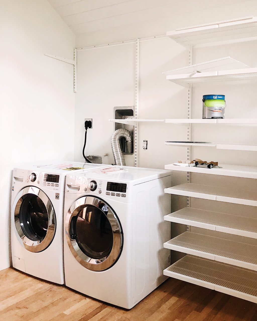 We’re getting so shut! Counter tops and backsplash went in final Monday and now we’re simply ready for the flooring to be sanded and stained and the customized bookcase to be put in. The closet built-ins went in just lately and we can not wait to get in there and arrange every little thing. We’re working with The Container Retailer on the design and might’t wait to share all of it! Washer/dryer are right here too, simply ready for the stacking equipment to reach so we will get every little thing in it’s place. We did laundry in our home yesterday for the primary time in six months with our Spotify tunes going and it felt so good!